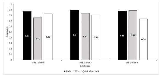 The best segmentation results obtained by the proposed approach for the three sites were evaluated with FLS segmentation in Erdas Imagine and the SMS method from ArcGIS Pro (Figure 11). For site 1, the proposed approach had the highest accuracy in comparison with the other two methods. The proposed approach produced an F-measure of 0.87, while the FLS method had segmentation accuracies of 0.76 and 0.83 using SMS. For unit 3, a higher F-measure was observed for the proposed approach (F-measure = 0.9) in comparison to the other methods (FLS: 0.84 and SMS: 0.81). For unit 4, FLS produced a slightly higher accuracy (0.89) than the proposed approach (0.88). FLS segmentation incorporates height information along with spectral and textural features for segmentation, which might have resulted in an increased F-measure.