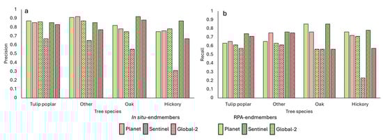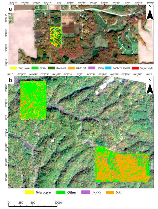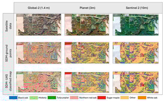 Recently, RPA has been utilized to directly create ground reference data or aid in semi-supervised modeling of satellite data for habitat mapping, grassland mapping, and biomass estimation at broader scales [,,]. Zhu et al. (2024) [] utilized RPA hyperspectral data for modeling grassland biomass at very high resolution, which was later aggregated to derive reference samples for deriving biomass to larger extents using satellite data. Alvarez-Vanhard et al. (2020) [] identified plant community abundances within wetland habitats using Sentinel and Pleiades satellite data incorporating RPA multi-temporal reference data. These studies are starting to explore the use of RPA for deriving reference samples for satellite-based classification for different ecological applications with no prior study focusing on broadleaf forest classification. A multi-scale explanation of forest species distribution is needed from local (crown level) to landscape (forest composition or dominant species distribution) scales. The use of emerging RPA data for complementing field measurements and satellite synergies for tree species mapping is yet to be fully studied.