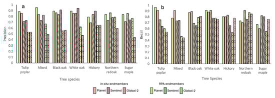 Tree species distribution maps produced from the ORF model highlight the spatial distribution of seven different broadleaf tree species at site 1 and four tree species (groups) distributions at site 2 (Figure 12). The species distribution map produced from RPA imagery was used for deriving reference spectra for satellite classification. Site 1 had an equal distribution of all seven species at a localized scale, whereas for site 2 (units 3 and 4), there were higher proportions of “other” and oak classes. Oak species including chestnut oak, white oak, black oak, northern red oak, and scarlet oak were predominant at site 2, hence large groups of oak distribution could be observed. Hickory distribution across all of the sites was minimal, mostly due to partial occurrence above the canopy as well as fewer training samples available for classification. Unit 3 within site 2 also had a higher tulip poplar proportion compared to unit 4 within site 2. Due to the complementary species distribution observed at both of the units, the in situ reference samples and the classified RPA map were merged for site 2.