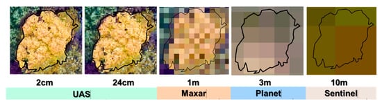 Advances in remote sensing have fostered multiple efforts to integrate remotely sensed datasets with field inventory data for expanding species distribution maps for broader scales [,,]. Satellite data have been predominantly utilized for mapping species distribution at landscape and larger scales [,,]. Although satellite data provides coverage for large extents with high spectral variability, the spatial resolution is limited []. When utilizing field-based inventory to derive reference data from moderate or coarse satellite datasets, such as Landsat and MODIS, a single pixel might cover multiple crowns; thus, there is an inherent representation of multiple species within a single pixel. Field inventorying to derive training samples also introduces significant uncertainties and bias due to mismatches between the ground location measurement and corresponding pixels of satellite datasets [,,,].