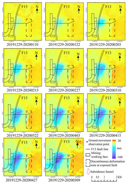 The time-series deformation map generated by SBAS-InSAR technology reveals that, as the mining face advances, the surface deformation continually expands, clearly showing a “subsidence-uplift” boundary at the fault outcrop. In the deformation map from 29 December 2019 to 10 January 2020, the “subsidence-uplift” at the fault outcrop is noticeable. This phenomenon becomes even more pronounced in the subsequent cumulative deformation maps, indicating that the fault’s disturbance effect on the stress distribution of the overlying rock strata above the mining face was active during this period. The overlying rock strata above the mining face have not yet reached stress equilibrium, leading to ongoing surface deformation. From 19 December 2019 to 15 February 2020, a “subsidence funnel” phenomenon is observed on the west side of the fault outcrop. As the mining face continues to progress, both the deformation and its range above the mining face expand, and the “subsidence funnel” on the west side of the fault outcrop also grows. This pattern is highly consistent with the surface deformation response mechanism of mining activities on the hanging wall of a fault. Due to the significant mining depth and fault displacement of this mining face, the fault’s disturbance effects on the mining operations are prolonged.