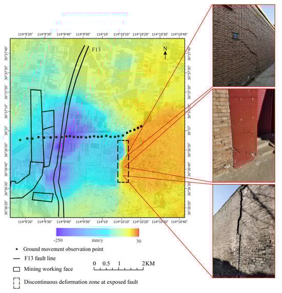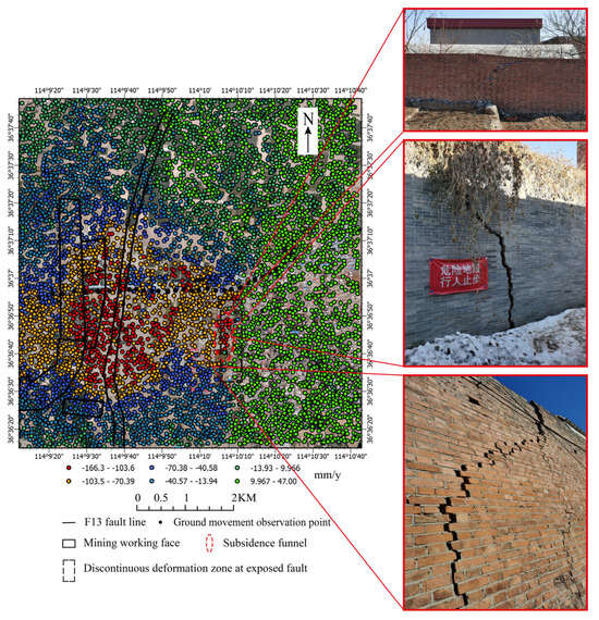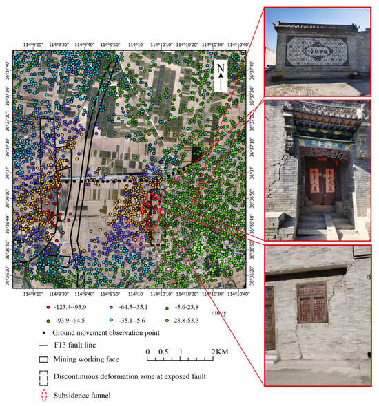 As illustrated in Figure 6, the StaMPS-InSAR method provides a relatively sparse distribution of effective monitoring points in this area, yet it delineates the “subsidence-uplift” boundary at the fault’s surface exposure. In addition, the deformation rate distribution derived from the StaMPS-InSAR method effectively captures the “subsidence funnel” on the west side of the fault surface, which is associated with the creation of detachment space. The eastern side, directly above the mining face, is located in the farmland area. Due to significant crop coverage and considerable deformation, as indicated by SBAS-InSAR, this area experiences severe temporal and spatial-phase mismatches, resulting in a poor temporal-phase stability. Consequently, the StaMPS-InSAR method is unable to provide effective monitoring for this area, leading to a lack of deformation data. Photographs taken on-site reveal that, in the fault’s surface rupture zone, the stress redistribution induced by fault disturbance causes a “subsidence-uplift” on the surface, leading to varying degrees of damage to surface structures, including the destruction of ancient buildings in Boyan Ancient Town.