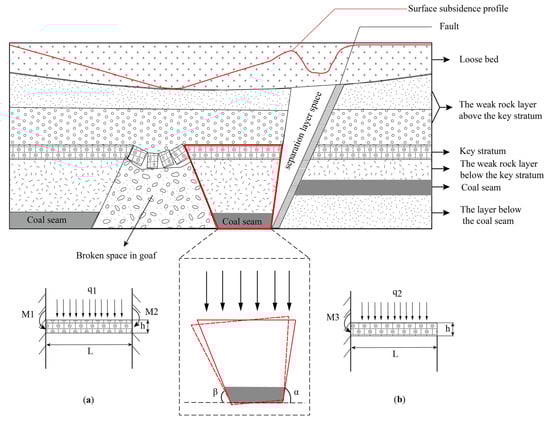After coal seam mining, the overlying rock layers are categorized based on their strength into four distinct parts: the key layer, the weak rock layer beneath the key layer, the weak rock layer above the key layer, and the loose layer [49]. As the mining progresses, the extraction of coal results in pressure release through top caving. This causes the overlying rock strata to fracture and collapse behind the mining face, creating a fractured space above the goaf and establishing a roof collapse angle β. This angle is the inclination between the fracture surface and the roof layer directed toward the goaf. The roof collapse angle influences surface subsidence by shifting the inflection point of the subsidence curve toward the goaf direction, which is a significant factor in surface subsidence. When the collapse angle of the roof is less than the dip angle, α, of the fault, the weak rock layer below the key layer tends to tilt toward the goaf due to gravity and the load of the upper rock layers. The compressibility of the collapsed rock in the goaf causes the weak rock layer below the key layer to generate a detachment space on the fault plane. According to masonry beam theory, in the presence of a fault in the overlying rock layer, before the key layer fractures initially, the key layer acts as a “fixed support” at one end. The separation space created by the key layer and the lower weak rock layer triggers movement in the upper weak rock layer, leading to further separation at the fault junction [50]. This detachment space causes a change in the stress of the upper loose layer, equivalent to a goaf, resulting in the formation of a “subsidence funnel” above the detachment space. From a mechanical perspective, when the working face does not affect the fault area and the cover layer remains undamaged, the rock structure behaves as a cemented beam, as depicted in Figure 9a. Here, the rock beam bends and fractures above the goaf, with both ends providing horizontal and vertical stress constraints and transmitting bending moments. As the working face advances and the stress changes in the cover layer impact the fault plane, the mechanical strength of the weak fault plane is considerably lower than that of the cover layer. Consequently, the endpoint of the cover layer near the fault gradually transforms into a simply supported beam structure, as shown in Figure 9b. This structure is characterized by vertical displacement constraints and the ability of the beam end to rotate freely.