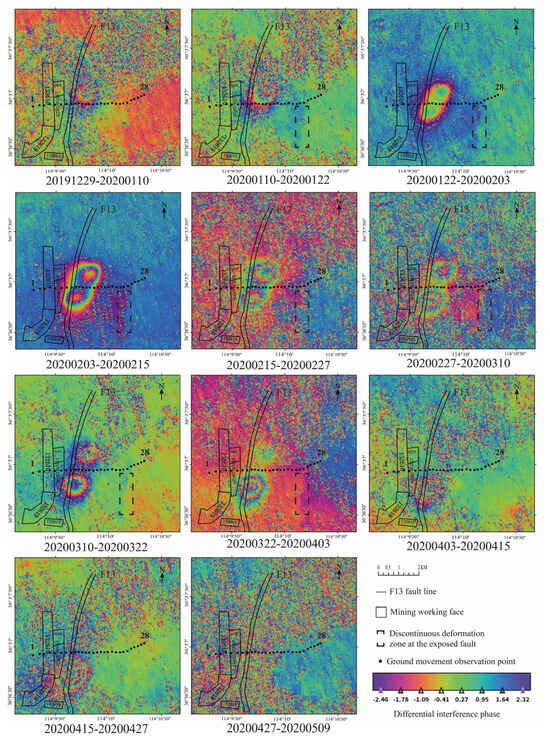 To assess the effects of mining activities on faults, a time-series differential interferogram sequence was obtained, as shown in Figure 10. Surface subsidence occurred between 29 December 2019 and 10 January 2020, due to underground mining at the 132,158 working face. During this period, the average coherence of the differential interferogram, created from two images, was 0.38 in the study area. High levels of noise in the interferogram resulted in blurred deformation boundaries, making it difficult to determine whether the fault had an impact on the deformation. From 10 January to 22 January 2020, the surface continued to subside, and the average coherence coefficient increased to 0.42. Although the noise level remained high, phase discontinuities (highlighted in the black box) were observed when the deformation reached the fault outcrop, indicating that the fault began to influence the distribution of surface deformation during this period.