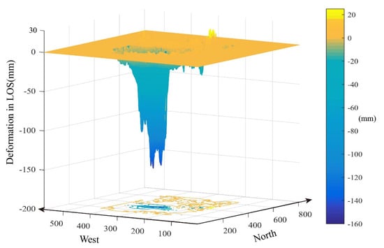 From 3 April to 15 April 2020, deformation continued with an average coherence coefficient of 0.42 with high noise levels in the interferogram, with no visible discontinuous signals at the fault exposure. From 15 April to 27 April 2020, subsidence continued, with an average coherence coefficient of 0.41 and high noise levels, showing no phase change signals at the fault exposure, suggesting that the disturbance effect of the fault on surface deformation had mostly ceased. From 27 April to 9 May 2020, the average coherence coefficient further decreased to 0.34, and the high noise level made it difficult to distinguish deformation phases from noise phases. The cumulative temporal deformation map obtained using the SBAS-InSAR method (Figure 4) shows continued surface deformation during this period. The three-dimensional cumulative deformation map (Figure 11) highlights a small “sinking funnel” near the surface “uplift” at the fault outcrop. This observation aligns with the theory of secondary subsidence caused by “separation space” formulation on the fault hanging wall during mining, confirming that fault disturbances during coal mining can lead to significant geological hazards and increased damage to surface structures.