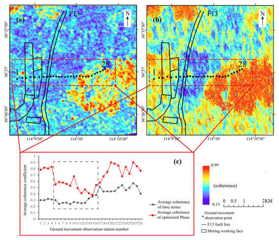 Comparison of average correlation coefficients before and after phase optimization ((a) average correlation coefficient from time−series D−InSAR; (b) average correlation coefficient after phase optimization; (c) comparison of correlation coefficients before and after phase optimization for the surface movement observation stations).