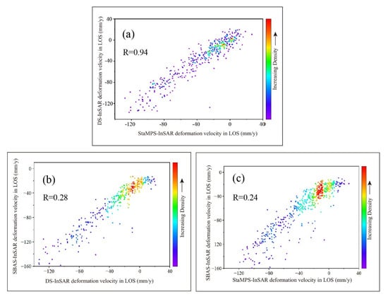 Pearson correlation coefficient analysis of monitoring results in the deformation zone. ((a) Pearson correlation coefficient between DS−InSAR and StaMPS−InSAR; (b) Pearson correlation coefficient between SBAS−InSAR and DS−InSAR; (c) Pearson correlation coefficient between SBAS−InSAR and StaMPS−InSAR).