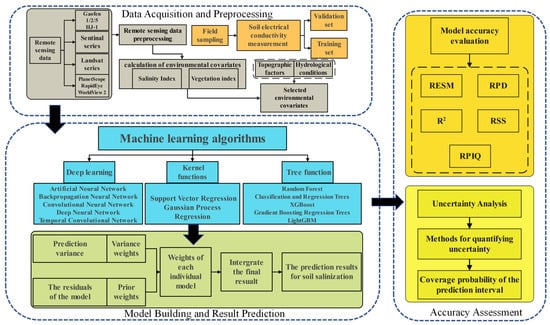 Various ML algorithms have been extensively employed for the rapid remote sensing monitoring of regional salinized soils [78]. The process of DSM in soil salinity mapping is shown in Figure 1. The uniformity and representativeness of the samples directly influence the model parameters and prediction accuracy. In the modeling process, data-driven ML models adjust and iterate parameters solely based on the characteristics of the current input data [79]. When certain sample data used in modeling exhibit pronounced regional local features, the resulting model may suffer from inadequate generality and generalization ability [80]. For instance, localized anomalies in environmental factors such as soil particle size distribution, moisture content, and vegetation cover can lead to atypical spectra in soil samples. These anomalies diminish the regional salinity information within the sample data and disrupt the mapping relationship between the actual soil salinity on the ground and the spectral features captured in the images [15]. A notable characteristic of geographic sample data is its spatial dependence. To enhance the accuracy and generalization performance of the model, Xu et al. [81] introduced a spatial correlation module in RF to identify and exclude these anomalous samples, thereby facilitating more accurate SSC mapping. While ML algorithms excel in modeling high-dimensional big data, achieving higher prediction accuracy typically necessitates a substantial number of training samples. In soil salinity mapping, acquiring extensive soil samples through field surveys is not only labor-intensive but also fraught with challenges. Specifically, field sampling often yields sparse and non-normally distributed soil sample data [82]. The high feature complexity of remote sensing image-derived variables not only complicates model construction but also frequently leads to diminished model prediction performance. To tackle this challenge, Wang et al. [34] proposed a model framework for soil salinity prediction that integrates sample data enhancement, feature selection, and model optimization. This strategy employs the Mix-up method to generate additional artificial samples, addressing the overfitting problem associated with sparse samples. Joint parameter tuning through Bayesian parameter optimization and Light Gradient Boosting Machine (LightGBM) enhances the model’s generalization capability. SHapley additive explanation (SHAP) values are utilized to compare the impact of features on SSC across different experimental scenarios, improving the model’s interpretability and reducing uncertainty. Recently, the CNN algorithm has garnered attention in various computer vision applications, including semantic segmentation, target detection, and image classification [83]. It extracts spatial and local distribution features using a sliding window approach and is applicable to data with three-dimensional characteristics. Compared to traditional ML algorithms and neural networks, CNN can effectively address the issue of neglecting spatial context in its architecture [84]. However, there are relatively few studies exploring the potential of CNN algorithms for soil salinity mapping. To comprehensively evaluate the application potential of CNN algorithms in soil science, Garajeh et al. [85] conducted CNN spatial distribution mapping of surface soil salinity in Lake Urmia and employed the Frequency Ratio (FR) model and Weights of Evidence (WOE) model to assess the classification results. Other specifically adopted ML methods include PLSR [52,57], Back Propagation Neural Network (BPNN) [35,51], SVR [35,39,86], RF [35,39,62,71,81], GPR [87], Extreme Learning Machine (ELM) [44], Cubist [9], MIXup_LGBM [34,69], Gradient Boosting Regression Trees (GBRT) [22,88,89], XGBoost [58,90], Grasshopper Optimization Algorithm (GOA) [87], Temporal Convolutional Network (TCN) [26], CNN [27,31,85], and Deep Neural Network (DNN) [87].