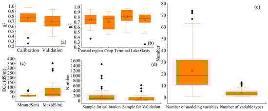 Statistical characteristics of the metadata include modeling accuracy, validation accuracy, mean and maximum values of ECe, prediction accuracy across different regions, sample size, number of variables, and types of variables: (a) Range of accuracy of calibration model and validation model; (b) Range of R2 values for modeling soil salinity in different regions; (c) Mean and maximum values of observed values; (d) Number of samples used to construct calibration model and validation model; (e) Number of variables and types involved in model construction. Rhombus are statistics for particular cases.