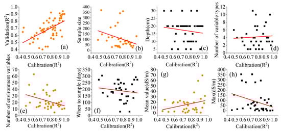 Impact of metadata on prediction accuracy: (a) Relationship between calibration model and validation model; (b) Effect of number of observation samples on accuracy of calibration model; (c) Effect of sample observation depth on accuracy of calibration model; (d) Effect of number of variable types on accuracy of calibration model; (e) Relationship between number of variables and calibration model; (f) Effect of measurement time within year on calibration model; (g) Relationship between mean value of measurement values and accuracy of calibration model; (h) Relationship between maximum value of measurement values and accuracy of calibration model. Orange dots indicate significant relationships (p < 0.05), black boxes indicate no significant relationships.