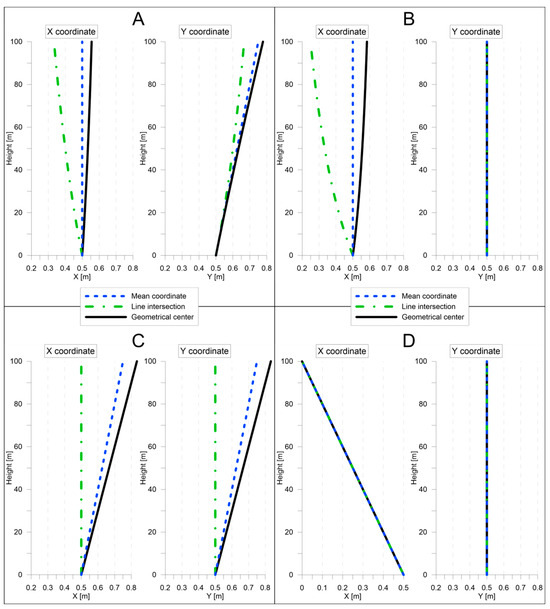 Based on the algorithms for determining the central point of a profile (MC, LI and GC) described in Section 2.4, the course of the main axis of the analyzed object was calculated in four different simulated cases (A, B, C and D). The following diagrams (Figure 6) show the determined changes in the position of the central point for the simulated displacements of the structure’s load-bearing elements.