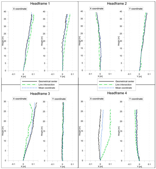 Despite the filtration processes carried out, there were results that differed from others. They influenced the determined coordinates of the structure’s axial points, but their number was small and due to their chaotic nature, they were easy to select. The process of determining the course of the axis was also carried out for the tested shaft towers. Graphs showing the course of the axes of each of the tested objects can be seen in Figure 7.