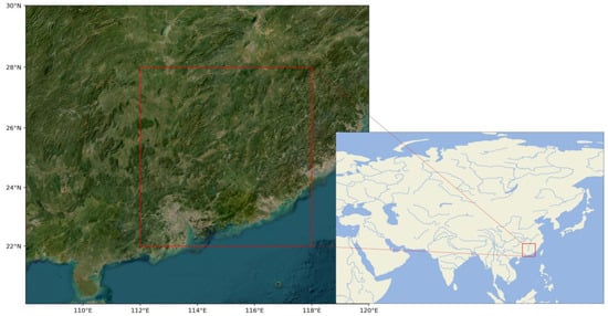 Our investigation targets the geographic region defined by longitudes 112°E to 118°E and latitudes 22°N to 28°N, with a grid resolution of 0.25° × 0.25°, as depicted in Figure 2. The selected region for our downscaling experiments was primarily influenced by its diverse climatic conditions and geographical significance. This area includes a variety of climatic zones, with distinct features ranging from coastal regions to varying inland topographies. This diversity presents an ideal scenario to test the effectiveness of our downscaling model in different climatic settings. Data for this area were sourced from the ERA5 reanalysis dataset. The training dataset is comprised of 21,912 sets, each containing samples from three consecutive hours, spanning the years 2010 to 2019, for a total of 87,648 h. For validation, we use a test set consisting of 2196 sets from the year 2020, also collected at three-hour intervals, totaling 8784 h. Our model aims to downscale these data to a finer one-hour temporal resolution. We evaluate the model’s performance across three meteorological variables: 2 m surface air temperature, 850 hPa geopotential height, and 850 hPa relative humidity. These variables are experimented with separately.