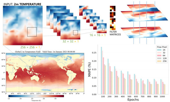 Figure 4. Overview of flow information extraction from the intermediate features post-encoder phase. Following encoding, these intermediate features undergo specific convolutional operations and resampling procedures to yield the flow information. The bar chart illustrates the Mean Absolute Percentage Error (MAPE) for various flow pixel resolutions across different epochs. The x-axis represents the training epochs, ranging from 100 to 1000, while the y-axis represents the MAPE in percentages.
