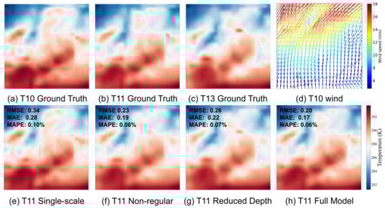 Figure 6. Visual comparison of ablation study results. We downscale the 2 m temperature fields from 10 a.m. to 1 p.m. on 21 January 2020, to obtain results for 11 a.m. Subfigure d depicts the wind field at 11 a.m., which offers indicative insights into temperature evolution.