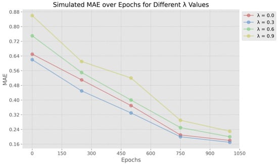 In our ablation study concerning the advection loss weight λ , we explore the statistical significance of its calibration for the accuracy of temporal downscaling in geophysical data. The detailed line chart in our manuscript illustrates how the mean absolute error (MAE) varies with different λ settings. With λ set to 0.3, the model achieves the lowest MAE values, suggesting that this level maximizes the benefit of incorporating flow information while also allowing for local atmospheric dynamics, such as radiative heating or cooling, to be adequately represented. On the other hand, a high λ value, such as 0.9, results in increased MAE, indicating a diminished ability to capture these local changes, as the model overly emphasizes adherence to the advected state. Conversely, the absence of advection loss ( λ = 0 ) leads to increased errors, highlighting the necessity of this term for improving downscaling accuracy.