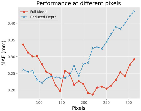 This performance is further illuminated when comparing the MAE curves between the full model and the reduced-depth model. The full model achieved a lower minimum MAE value of 0.17 as opposed to the reduced model’s 0.22. This can largely be attributed to the residual modules in the full model, which allow for a more efficient and resilient feature extraction process. These modules facilitate better generalization across varying pixel sizes, thus accounting for the full model’s more effective U-shaped performance curve in MAE across a broader range of pixel sizes.