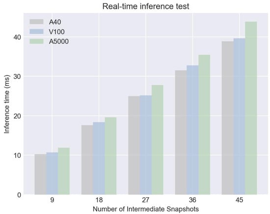 In addition to the performance metrics discussed earlier, another significant advantage of our model is its capability to support real-time inference (see Figure 9). A set of experiments was conducted to evaluate the model’s speed performance across multiple hardware configurations—A40, V100, and A5000. The inference time was observed at different intermediate snapshot levels: 9, 18, 27, 36, and 45. Remarkably, even at 45 intermediate snapshots, the inference time did not exceed 44 ms on A5000, and it was even lower on A40 and V100 setups, clocking at approximately 39 ms and 38 ms, respectively. This rapid inference time positions our model as not only accurate but also highly practical for real-time applications in weather forecasting and climate studies.
