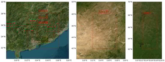 Figure 10. Illustration of five selected areas, labeled Area I to Area V, showcasing the variations in both spatial extent and latitude. Area I, Area II, and Area III represent regions where the spatial domain progressively decreases in size, providing a comparative perspective on how varying spatial scales influence the model’s performance. Additionally, Area I, Area IV, and Area V are arranged in ascending order of latitude, allowing for an examination of the impact of latitudinal differences on the effectiveness of temporal downscaling.