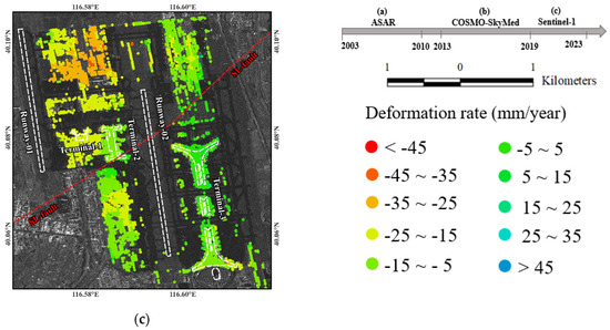 Utilizing the IPTA technique, the surface deformation rate along the Line of Sight (LOS) in three types of SAR data were extracted, as illustrated in Figure 2. A uniform color scheme was applied to represent the deformation values, where positive values indicate movement towards the satellite and negative values signify movement away from it, corresponding to downward ground motion. The results from all three datasets consistently revealed significant subsidence occurring at BCIA from 2003 to 2023. The subsidence was predominantly concentrated in the northern and western regions, consistent with prior InSAR studies [9,17].