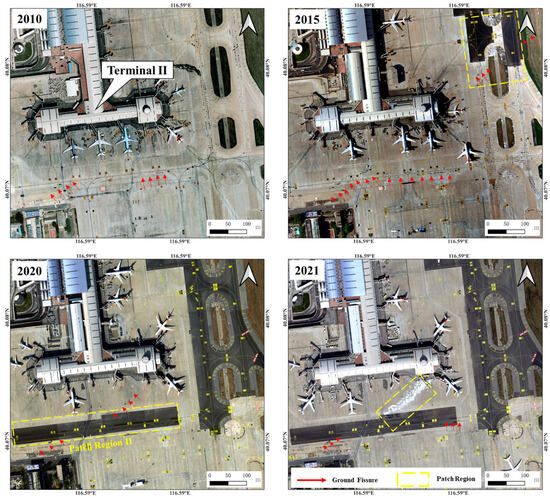 As illustrated in Figure 2, the subsidence at BCIA exhibited distinct zoning characteristics as shown by the three types of SAR data. The deformation disparities between the northwest and southeast directions were substantial. Uneven subsidence had been occurring at the airport for multiple years and in regions with notable differences in deformation rates, surface damage phenomena should be more pronounced. These could include phenomena such as damage to artificially hardened surfaces, buildings, pipelines, and more. To trace the impact of uneven subsidence on the airport and facilitate a more direct assessment of surface damage within uneven subsidence areas, we collected optical images with a resolution of 0.2 m from 2010 to 2021.