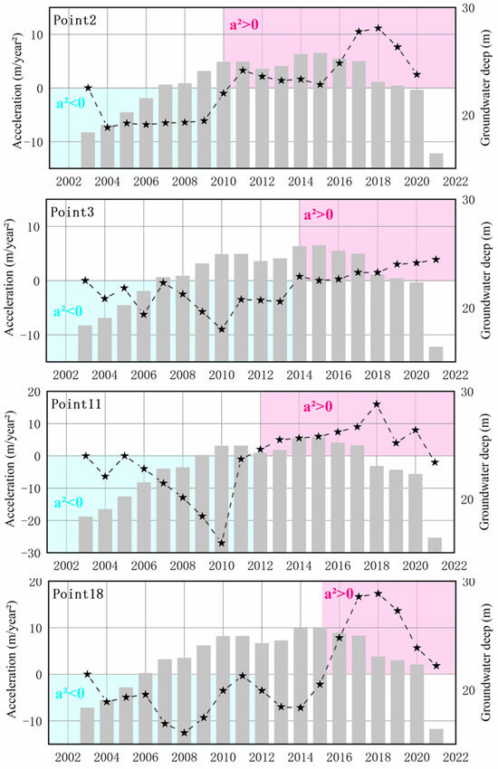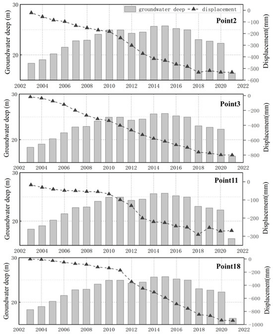 From the four characteristic points, it can be observed that between 2003 and 2010, the land slowly subsided. During this period, the groundwater level progressively decreased, showing a good consistency between subsidence and variations in groundwater depth.