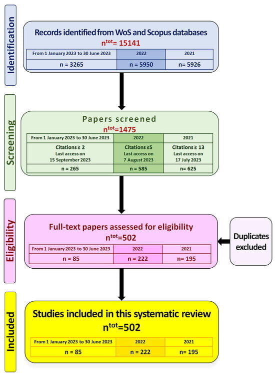 As the search engines identified 15,141 papers published in this time (blue rectangle in Figure 1), the other criterion selected to screen the eligible papers was their number of citations.
