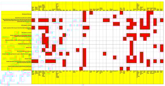 A study of the eligible papers highlighted that the authors mapped or monitored 39 parameters. Their analysis also showed that some authors mapped only one parameter, whereas others mapped multiple parameters. These parameters are listed in alphabetical order in Table 3 (first column). The second column shows the number of papers that mapped or monitored the parameter. Among these papers, the number of papers that mapped only this parameter and the number of those that also mapped other parameters are listed in the third and fourth columns, respectively.