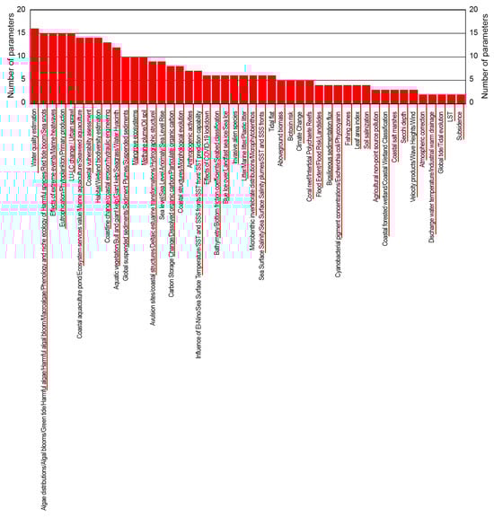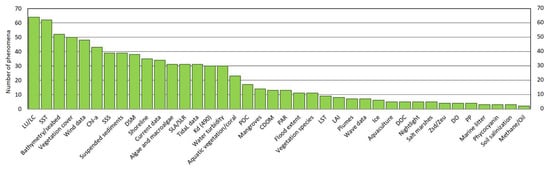 In order to explain how the authors exploited the 396 products, a careful analysis was performed. The following is an explanatory overview of them. Regarding chlorophyll-a products, Nadhairi et al. [59], for example, employed the daily mean chlorophyll-a satellite data (spatial resolution of 4 × 4 km) that were provided by the Copernicus Marine Environmental Monitoring Center (CMEMS). Regarding the digital elevation model, Xu et al. [60], for example, compared some products that play a critical role in flood simulation. Regarding dissolved iron products, Zanaty et al. [61], for example, compared land use and land cover maps with some water quality products that were provided by CMEMS to assess the anthropogenic impacts on environmental sustainability. Regarding hydrodynamic products, Brempong et al. [62], for example, utilized data produced by the Laboratory of Geophysical and Oceanographic Spatial Studies of Toulouse to assess the major factors contributing to coastal flooding. Regarding sea level altimetry products, Passaro et al. [63] and Pujol et al. [64], for example, compared some products. Regarding sea surface salinity products, Vazquez-Cuervo et al. [65], for example, analyzed the RSSSMAP (Remote Sensing Systems 70 km Soil Moisture Active/Passive Derived Sea Surface Salinity L3) and JPLSMAP (Jet Propulsion Laboratory Soil Moisture Active/Passive Derived Sea Surface Salinity) products to identify sea surface temperature and sea surface salinity fronts along the California coast. Regarding sea surface temperature products, Cavalli [66,67] and Kartal [68], for example, exploited several products to analyze the prediction capabilities of different models. Regarding primary production products, Tilstone et al. [69], for example, analyzed some products of CMEMS.