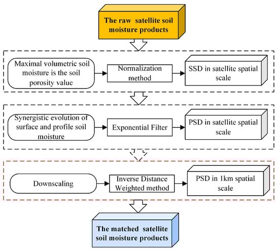 The chosen remotely sensed product provides surface volumetric soil moisture (SVSM), given in m3m−3 for satellite-observed spatial scales. In order to match DDRM PSD, satellite-observed SVSM data were transformed into PSD data in the corresponding spatial scales. When comparing the PSM datasets at a model-simulated spatial scale (1 km × 1 km), the preprocessing procedures of satellite data include the downscale step; when comparing the PSM datasets at a satellite-observed spatial scale, the downscale step is skipped. The framework to acquire matched PSM from the remotely sensed product is shown in Figure 2.