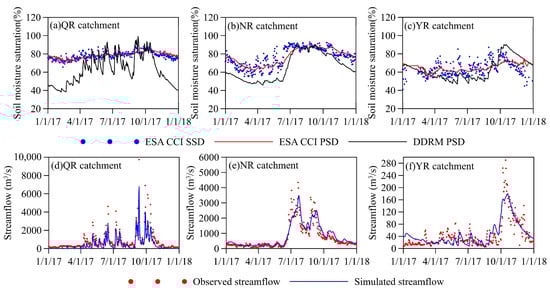 Time series of catchment-averaged surface saturation degree (SSD) and profile saturation degree (PSD) acquired from ESA CCI, and PSD simulated by DDRM (a–c), with the corresponding streamflow simulated by DDRM (d–f) in the QR, NR, and YR catchments.