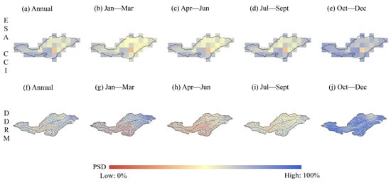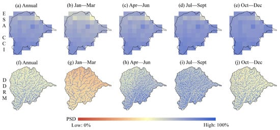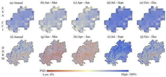 The spatial pattern of the annual averages and seasonal averages of profile saturation degree (PSD) acquired from ESA CCI ((a–e), 25 km × 25 km) and DDRM ((f–j), 1 km × 1 km) in the NR catchment during 2017.