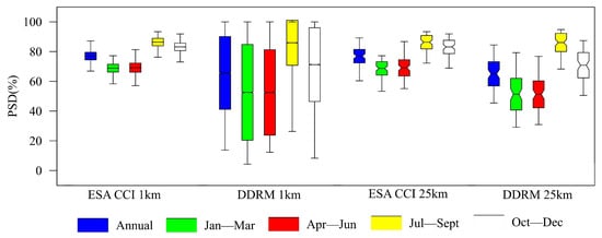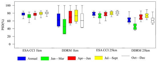 When comparing the spatial patterns of PSD in different seasons (January–March, April–June, July–September, October–December, shown as Jan–Mar, Apr–Jun, Jul–Sept, Oct–Dec respectively), it can be seen that the spatial patterns of ESA CCI and DDRM PSD show similar changing trends from January to December. In the QR catchment and NR catchment, the values of PSD spatial data are relatively high in the Jul–Sept period, and in the YR catchment, those are higher in the Oct–Dec period, which is consistent with the changing trends in the corresponding time series, as shown in Figure 3. This is because the rainfall values are concentrated in the Jul–Sept period for the QR and NR catchments and in the Oct–Dec period for the YR catchment. When comparing the spatial patterns of PSD in catchments with different climate conditions, the spatial distribution of ESA CCI PSD is similar to the DDRM PSD in the QR and the NR catchments, while that of ESA CCI PSD is different from that of DDRM PSD in the YR catchment, where the DDRM PSD patterns show higher values in the downstream but the ESA CCI PSD patterns show higher values in the upstream. The reason is that the runoff generation mechanism used in DDRM is different from the actual mechanism in the YR catchment. Moreover, the loess covering the eastern plain in the YR catchment also affects the actual spatial distribution of PSD patterns. On the whole, the spatial variations in ESA CCI and DDRM PSD are, overall, consistent and locally different; the possible driving factors of the PSD spatial patterns can be studied further.