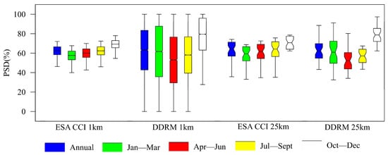 The spatial patterns in the ESA CCI and DDRM PSD averages for different seasons and the whole year of 2017 are shown in Figure 4, Figure 5 and Figure 6 for the QR catchment, NR catchment, and YR catchment, respectively. In the 1 km × 1 km spatial scales, the sample sizes of the PSD datasets are 39,211, 41,715, and 18,560 in the QR, NR, and YR catchments, respectively, and in the 25 km × 25 km spatial scales, the sample sizes are 63, 67, and 30 for the three catchments. From the figures, it can be seen that there is an obviously gradual trend in DDRM PSD from the upstream area to the downstream area, while ESA CCI PSD has no similar trend. This is because the simulation processes of DDRM PSD in each grid of the model are affected by the PSD values of other grids, but the observation and retrieval process of ESA CCI PSD in each grid is relatively independent. Moreover, it can be seen that both the ESA CCI PSD and the DDRM PSD data show higher values in the low-elevation areas (normally downstream) than in the high-elevation areas (normally upstream). This means that the elevation or slope may be the key driving factors of PSD. Moreover, the river network in each catchment is clearly displayed in the spatial distribution map of the DDRM PSD averages. This is due to the saturation excess runoff generation mechanism applied in DDRM, where the soil is always saturated in the grid points of the river network, which means PSD always equals 1 in the grids of the river network.