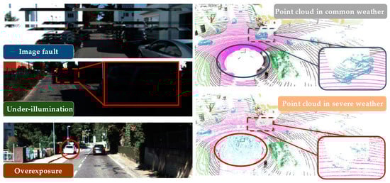 Fusion-based methods critically rely on the availability of accurately paired data, specifically precise point-pixel mapping between LiDAR and camera data. This mapping is crucial for both the training and inference stages. Thus, any data error or sensor malfunction could have detrimental impacts on segmentation performance and might even lead to algorithm failures. Figure 2 illustrates this vulnerability; for example, cameras are susceptible to light interference, which can result in issues like image confusion, blurriness, overexposure, and other anomalies, while LiDAR sensors can be affected by weather conditions like rain, snow, and fog, leading to phenomena such as “ghost” points or a significant reduction in the amount of point cloud data.