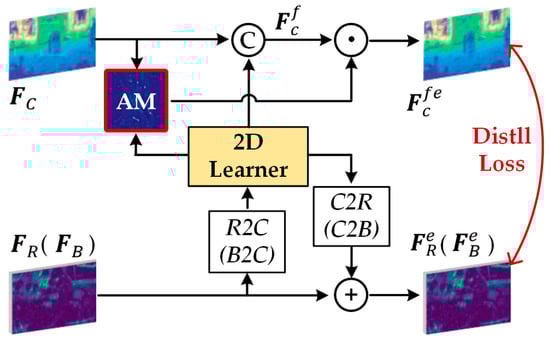 The proposed cross-modal knowledge distillation module (see Figure 4) first fuses the paired 2D and 3D features based on the attentional mapping (AM); then, it distills the enhanced fusion features and the enhanced 3D features in a unidirectional alignment. In this manner, we can transfer the comprehensive information from multi-modal data into the LiDAR model for its feature enhancement, while retaining its specific characteristics. Below, we take Image-RV as an example to analyze the process.