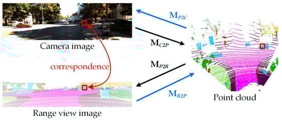 A promising method to overcome such limitations lies in the incorporation of camera images, which provide a wealth of dense semantic features, including color and texture information. Consequently, LiDAR–camera fusion is a strategic approach to enhance the accuracy and robustness of 3D semantic segmentation methods in challenging environmental conditions [,]. Utilizing sensor calibration matrices, current LiDAR–camera fusion approaches typically adopt one of two primary strategies: either projecting image pixels onto LiDAR coordinates and performing feature fusion approaches within the sparsely populated LiDAR domain [,,,,], or projecting point clouds onto image planes using perspective projection to merge corresponding multi-modal features [,,,,,].