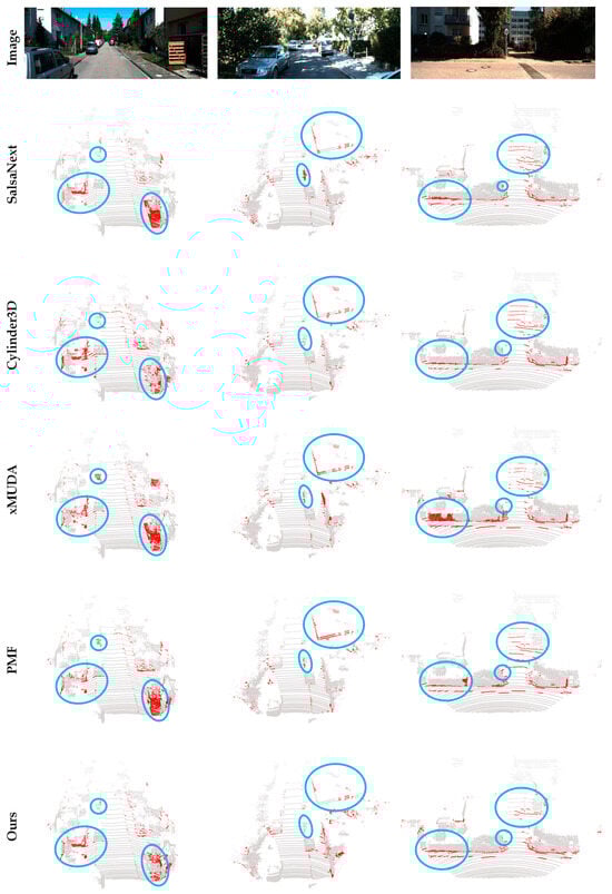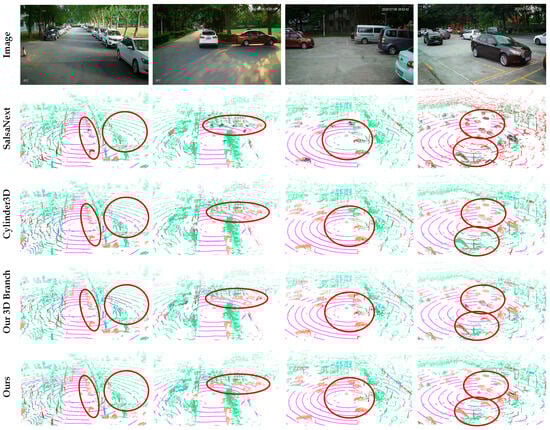 It is obvious that our method outperformed all the methods in terms of mIoU; to be specific, there was a 4.6% improvement from the best LiDAR-only method, Cylinder3D, and 4.7% from the best fusion-based method, PMF. Moreover, our method could still guarantee the real-time performance, since an 83 ms processing time is less than 100 ms (calculated from 10 Hz LiDAR collection frequency).