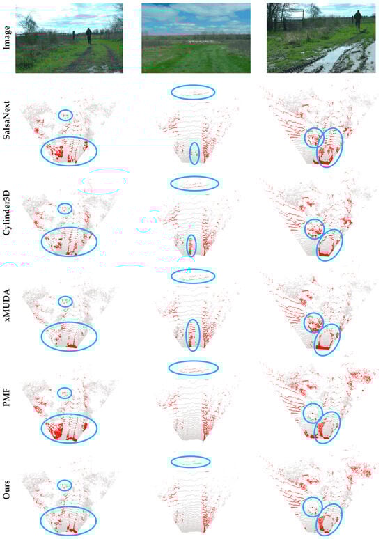 Furthermore, our method exhibited superior performance in 9 out of 14 classes, particularly excelling in small objects (e.g., pole, log, and fence) and classes with similar geometric features (e.g., grass, concrete, mud, and rubble), where LiDAR point features are typically insufficient. This conclusion is further supported by the qualitative comparison results shown in Figure 7.