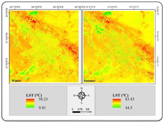 Before calculating the LST maps, the remote sensing images were downscaled to the pixel size of the Landsat-8 spectral bands (30 m) using the DisTrad method. The LST maps were prepared for the two seasons (winter and summer) for both 2019 and 2020, and used as the basis for models’ learning (Figure 3). In general, the LST results in the summer ranged from 79.5 °C to 67.42 °C in 2019, and from 80.8 °C to 49.11 °C in 2020. In winter, the maximum and minimum LST were 41.4 °C and 35.6 °C in 2019, and 50.8 °C and 21.8 °C in 2020, respectively (Figure 3). The low minimum values in 2020 were confirmed by a local unofficial weather station.
