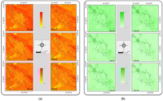 (b) The NDVI index to assess the cooling effect of vegetation on the surface. Higher NDVI values indicate more vegetation cover, which can lead to lower LST values due to evapotranspiration and shading [67].