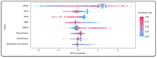 The extracted optimal model exhibited high accuracy in predicting the LST for the utilized dataset. Table 5 presents the calculated importance and effect of ground surface parameters on LST during the summer and winter seasons. It shows that albedo is the feature with the highest importance for predicting LST, accounting for 80.3% for summer and 72.7% for the winter season. NDVI is the second parameter with the highest importance and influence on LST, accounting for 11.27% for summer and 17.21% for winter seasons. The third most important parameter in the summer season was the NDBaI, with an importance equal to 3.2%, whereas for the winter season, the NDBI was more effective, with an importance equal to 4.45%. Other parameters (fourth to eighth) had an importance (almost) equal to 1%.