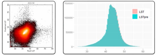 Based on model predictions, the LST images of the winter and summer of 2021 are shown in Figure 4. In 2021, the predicted values for the summer range between 83.4 °C and 44.5 °C, and for the winter between 58.23 °C and 9.81 °C.