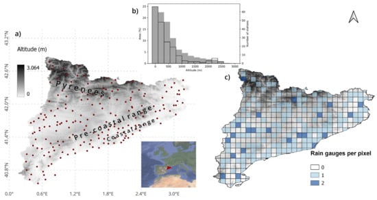 (a) Digital elevation model of the study region and network of automatic weather stations (red dots); (b) Histograms of altitude distribution of the terrain (% of Catalonia’s area, dark shaded gray) and automatic weather stations (unfilled contours); (c) Number of rain gauges per IMERG pixel.