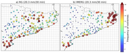 A graphical inspection allows us to detect a great similarity between the maximum values estimated by IMERG Early and Late. Both products show a large underestimation of the maximum threshold detected by the RG in time aggregations below 6 h, which is more marked on the half-hourly scale. In fact, from 6 h to 18 h, IMERG showed a change in the trend of overestimating precipitation records compared to the upper envelope curve of RG. The higher exponent of b in the fitting equation of the IMERG products suggests that satellite estimates of extreme rainfall increase at a higher rate with duration than RG extreme precipitation records. This is related to the higher frequency of extreme precipitation events (Figure 3), especially in northeastern Catalonia. It should be mentioned that these IMERG extremes are only evaluated on the pixels closest to the location of RG rainfall events, discarding other IMERG values that can be higher.