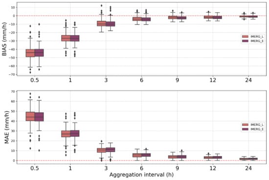 The evaluation of IMERG Early and Late products compared with RG records was performed for selected sub-daily and daily time aggregations. Figure 4 shows the boxplots of BIAS and MAE for both products, considering a precipitation intensity threshold of 18% of the envelope curve. In this figure, the first quartile, median, and third quartile of the distribution are identifiable considering errors calculated at all stations in the study region; boxplot whiskers extend to the 1.5 interquartile range and outliers extending further away are also plotted. For consistency between the aggregations, the results are shown in mm/h.