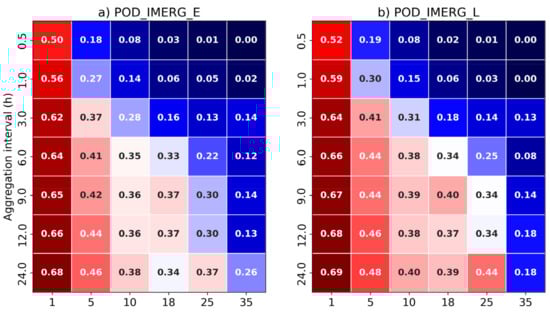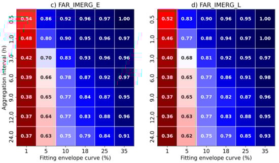 Figure 5 shows POD and FAR values based on the contingency table elements for each temporal aggregation, and according to the envelope curve-based precipitation intensities. The detection of precipitation events with acceptable skill (dark reddish-shaded colors in Figure 5, that is, POD ≥ 0.5 and FAR ≤ 0.5) is limited in both products mostly for precipitation intensities greater than or equal to 1% and greater than 6 h of temporal aggregation. The ability of IMERG to identify extreme rainfall events decreased substantially with increasing rainfall intensity and temporal resolution. If we consider thresholds greater than or equal to 5% of the envelope curve, no temporal aggregation exceeds 50% of correctly detected cases. This behavior is more critical in the detection of events at 30 min and 1 h, where thresholds higher than 10% of the curve do not exceed 8% (30 min) and 15% in 1 h, respectively. According to these results, IMERG cannot detect events above or equal to 5% of the envelope curve.