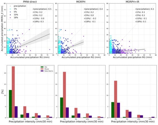 In Figure 6 (top row), a clear underestimation for all IMERG sources is evident, as all fit lines and the associated 90% error areas are well below the diagonal of the scatter plot. This was even more marked in the case of MORPH+IR for higher rainfall intensity thresholds. Figure 6 (bottom row) shows the elements of the contingency table for each source contributing to the IMERG estimate, according to the selected intensity threshold. Note that the correct negatives, which represent more than 90% of the cases, are not shown. As expected, the hit fraction degrades with increasing rainfall rate thresholds, and in all cases, the estimates showing the highest skill in event detection come from the direct PMW sensors, followed by MORPH. In fact, for thresholds greater than or equal to 20 mm/30 min, the few cases detected by IMERG are due to the PMW sensors. Previous studies [14,51,52] have shown that PMW data generally represent precipitation rates better than IR data because PMW radiometers are sensitive to hydrometeor precipitation in the atmospheric column, unlike IR sensors, which are limited to cloud top measurements. In particular, the authors of [12] mentioned that IR retrievals misjudge cold cloud features as rain and not precipitation anvils.