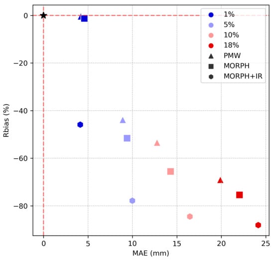 Scatter plot of Rbias (mm) versus MAE (mm) for each IMERG data source (PMW, MORPH, and MORPH+IR) and stratified according to rain gauge precipitation intensities (1%, 5%, 10%, and 18%). The marked point (black star) is the reference for no errors, whereas the bottom right is the location with the highest errors.