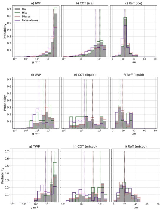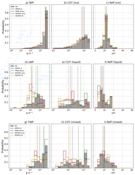 Figure 8 compares the probability distribution of cloud top properties around all time steps of intense precipitation greater than or equal to 1%. IMERG Early estimates and different sources were considered for comparison with RG. Only daytime precipitation samples were represented, as COT and retrievals were not available during the night. Although available, IWP, LWP, and TWP are limited to the same time set for consistency.